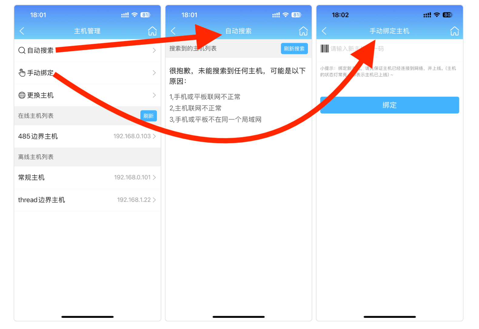 若手机与主机在同一个局域网中,可使用自动搜索,再选择主机进行绑定。