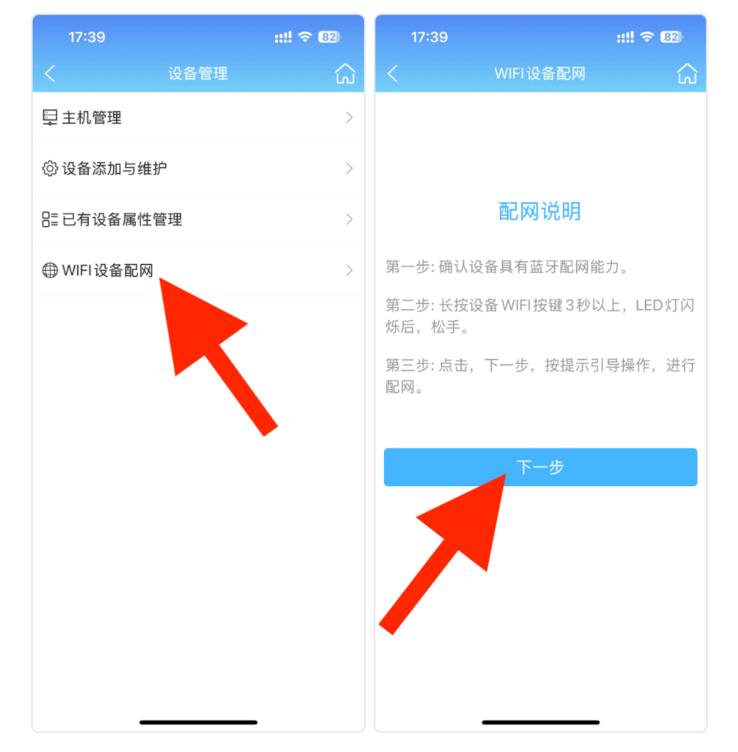 右上角设置图标 → 设置管理 → 设备管理 → Wi-Fi设备配网。 - 进入 Wi-Fi 设备配网页面,根据配网引导,完成对主机的配网即可。