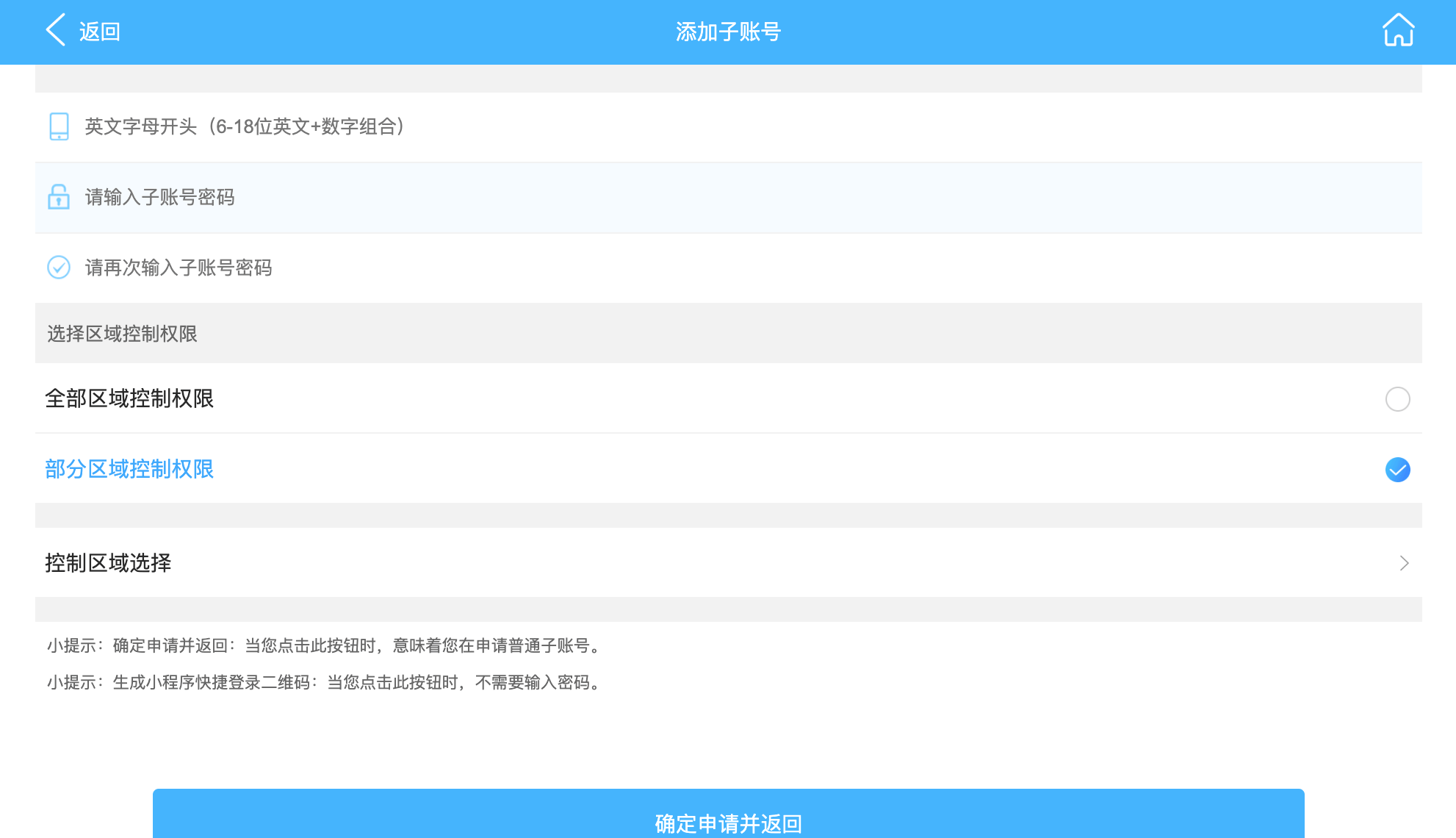 添加子账号,进入添加子账号页面,依次填写相关信息。
